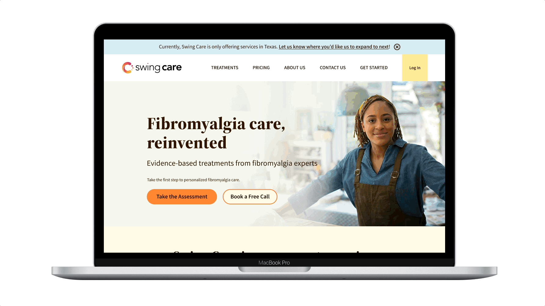 When I joined Swing Therapeutics, the company was gearing up to launch Swing Care, a virtual clinic specializing in fibromyalgia. While the rest of the organization was working on building the virtual clinic, the product team was focusing on the Swing Care marketing website, developing the low-fidelity desktop prototypes and refining the copy. Our goal was to position Swing Care as a leading authority in treating fibromyalgia and foster new patient growth.
