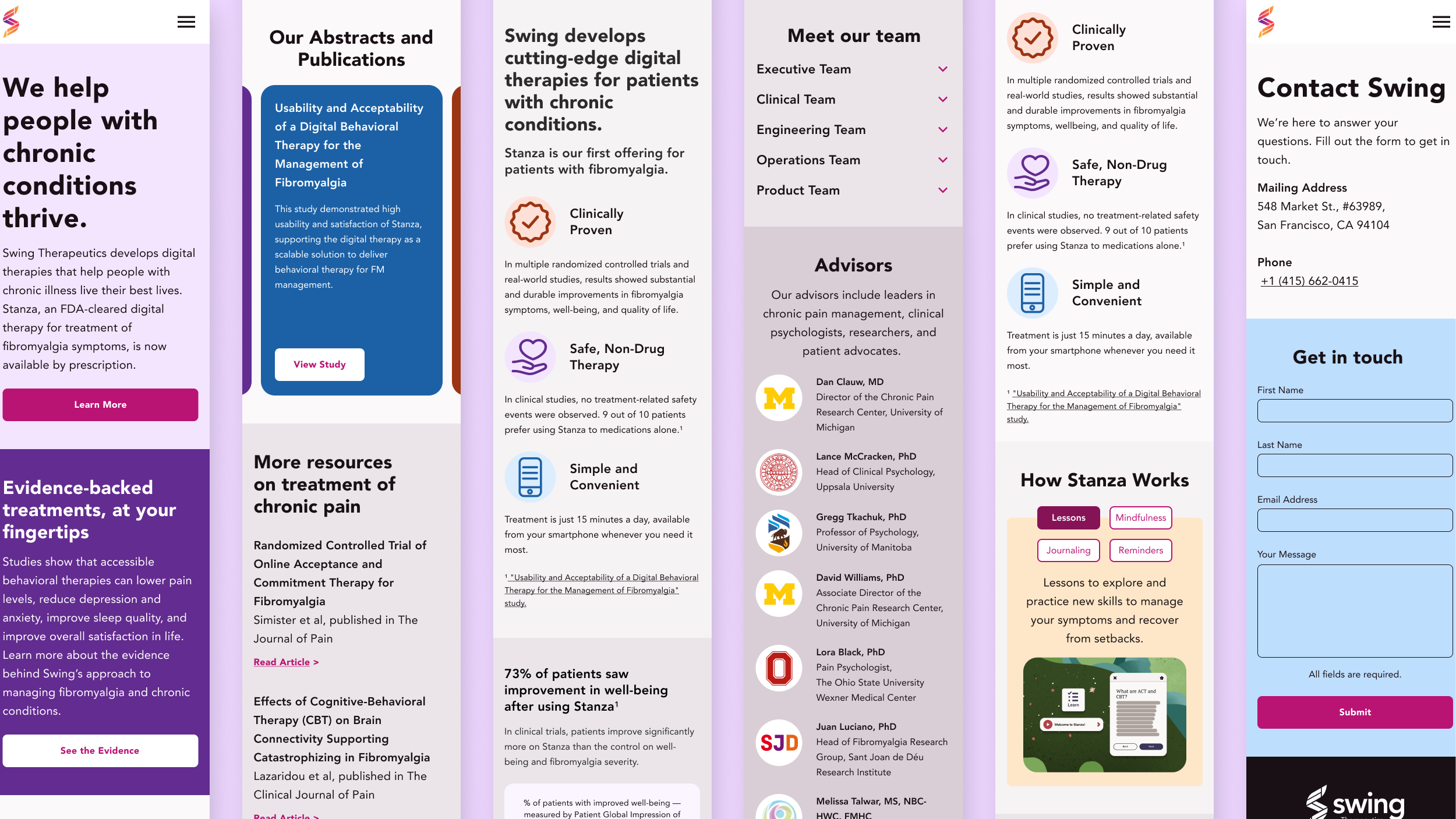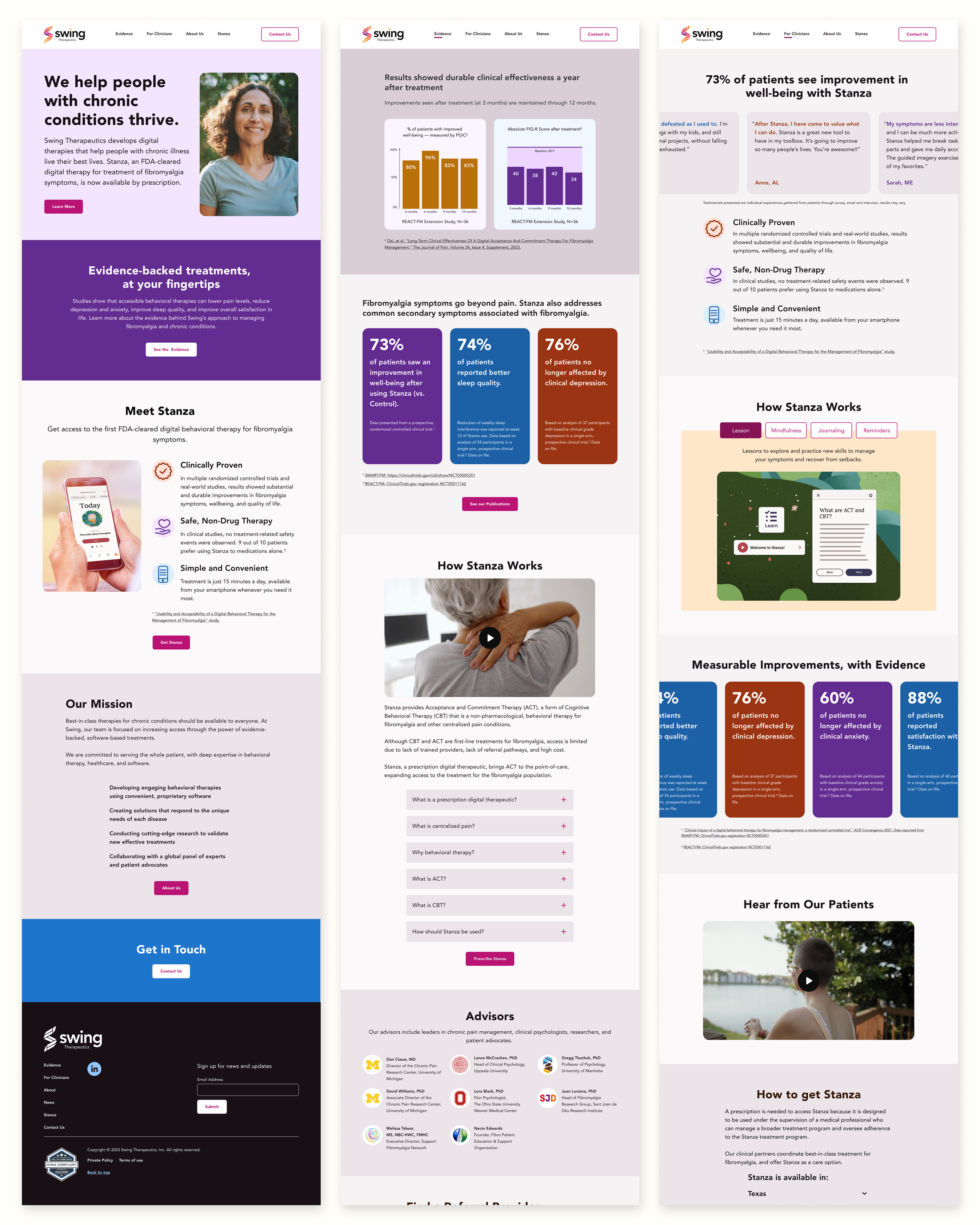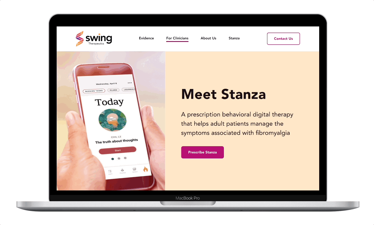 As part of its go-to-market strategy in anticipation of FDA approval for Stanza, its digital therapy for fibromyalgia, Swing Therapeutics needed to update its website to communicate its new messaging to key audiences—clinicians, investors, payers, and potential patients, while fulfilling its business goals.