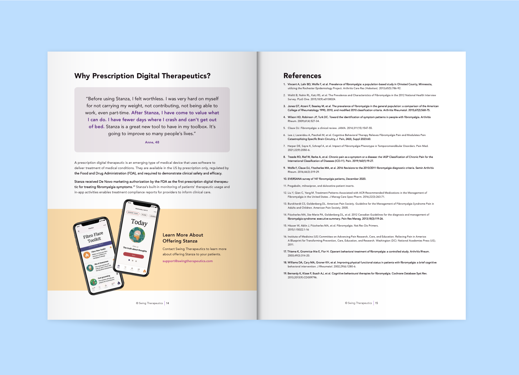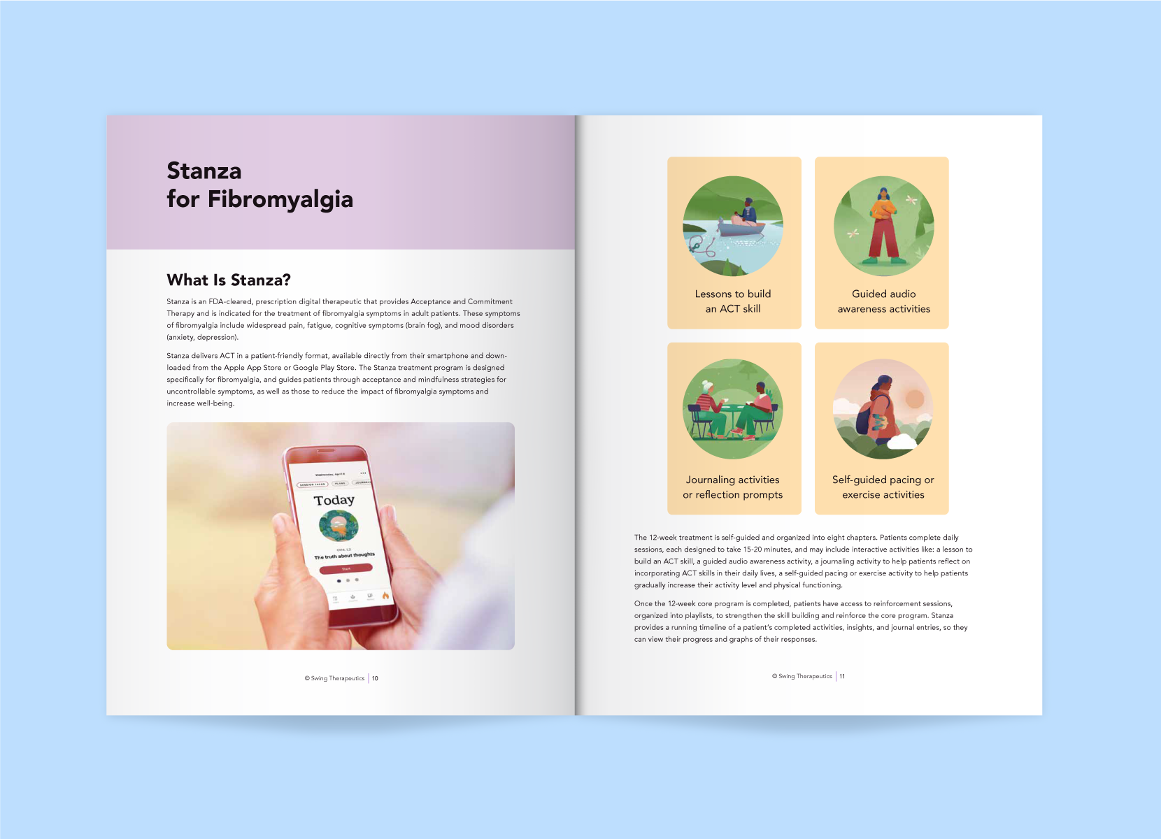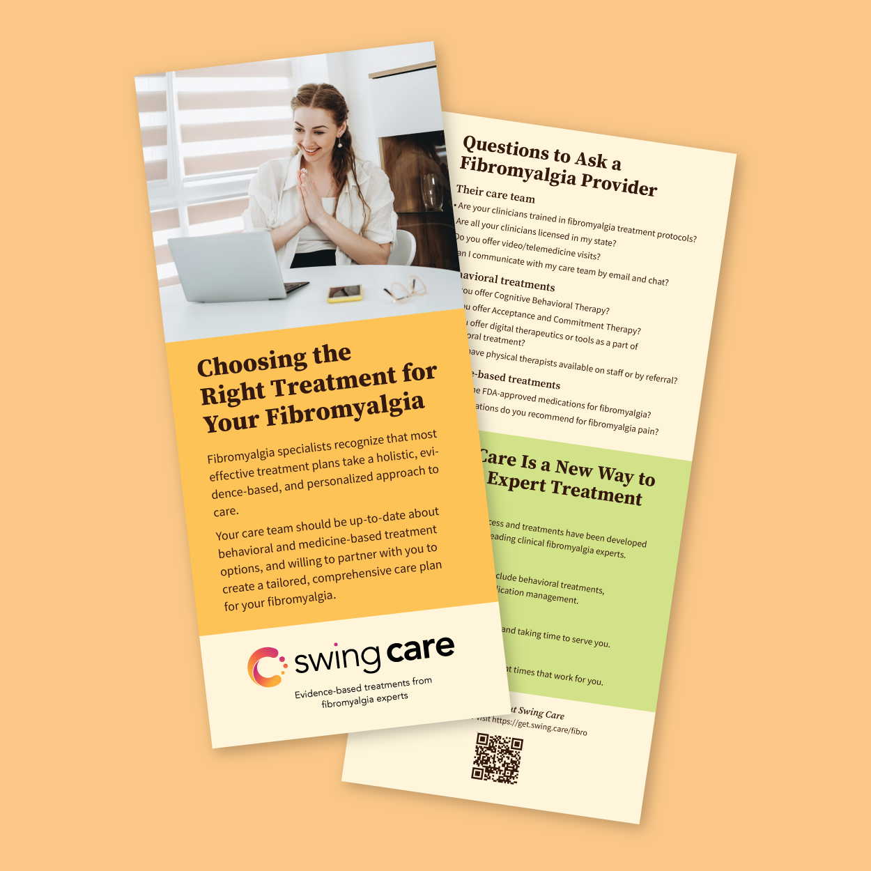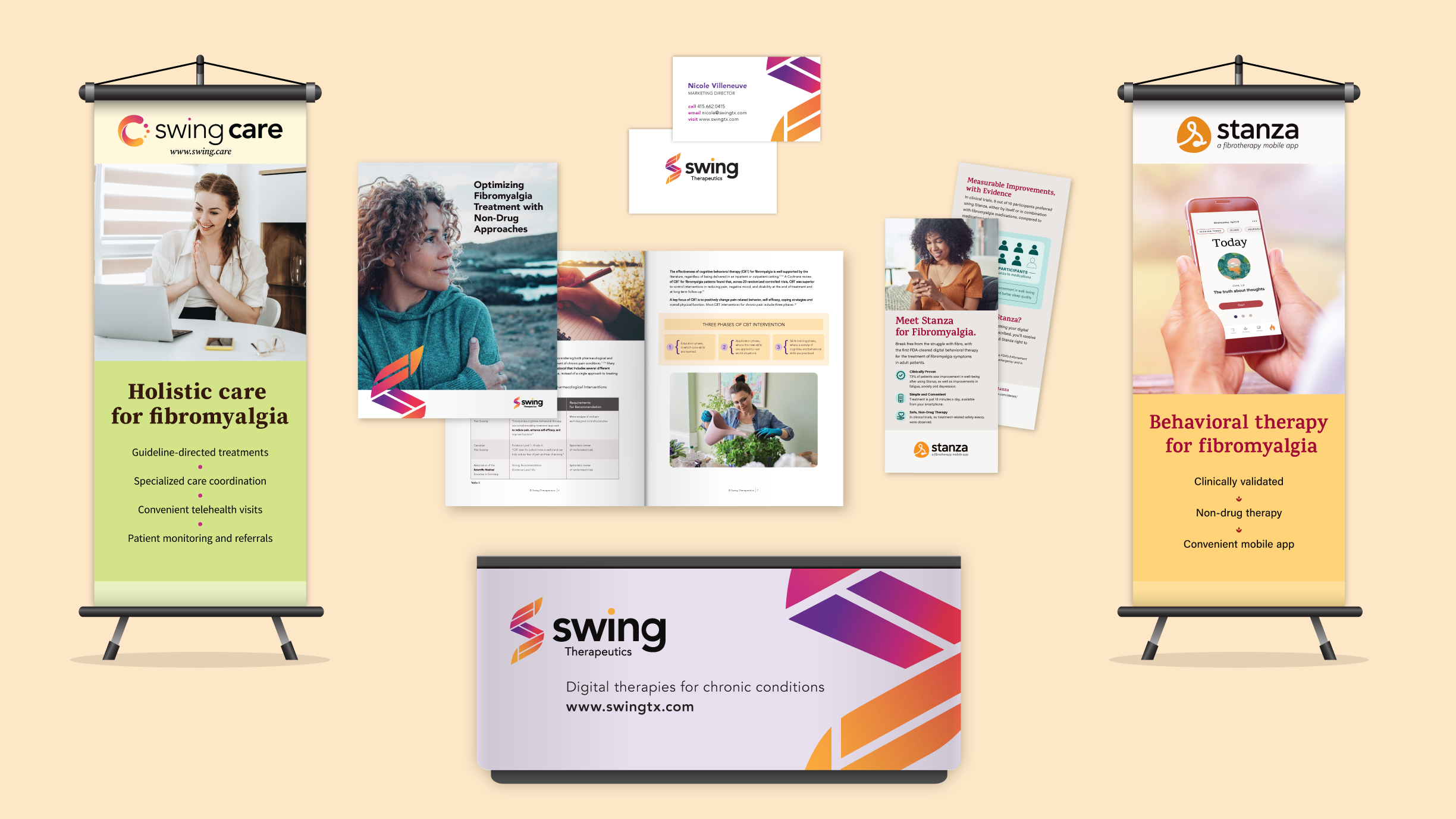 Two rack cards were designed to support quick, clear conversations at the booth, one for Swing Care, the fibromyalgia-focused clinic, and one for Stanza, the digital therapeutic app. Each card highlighted a distinct offering while maintaining visual consistency, giving healthcare providers an easy takeaway to reference after the conference.