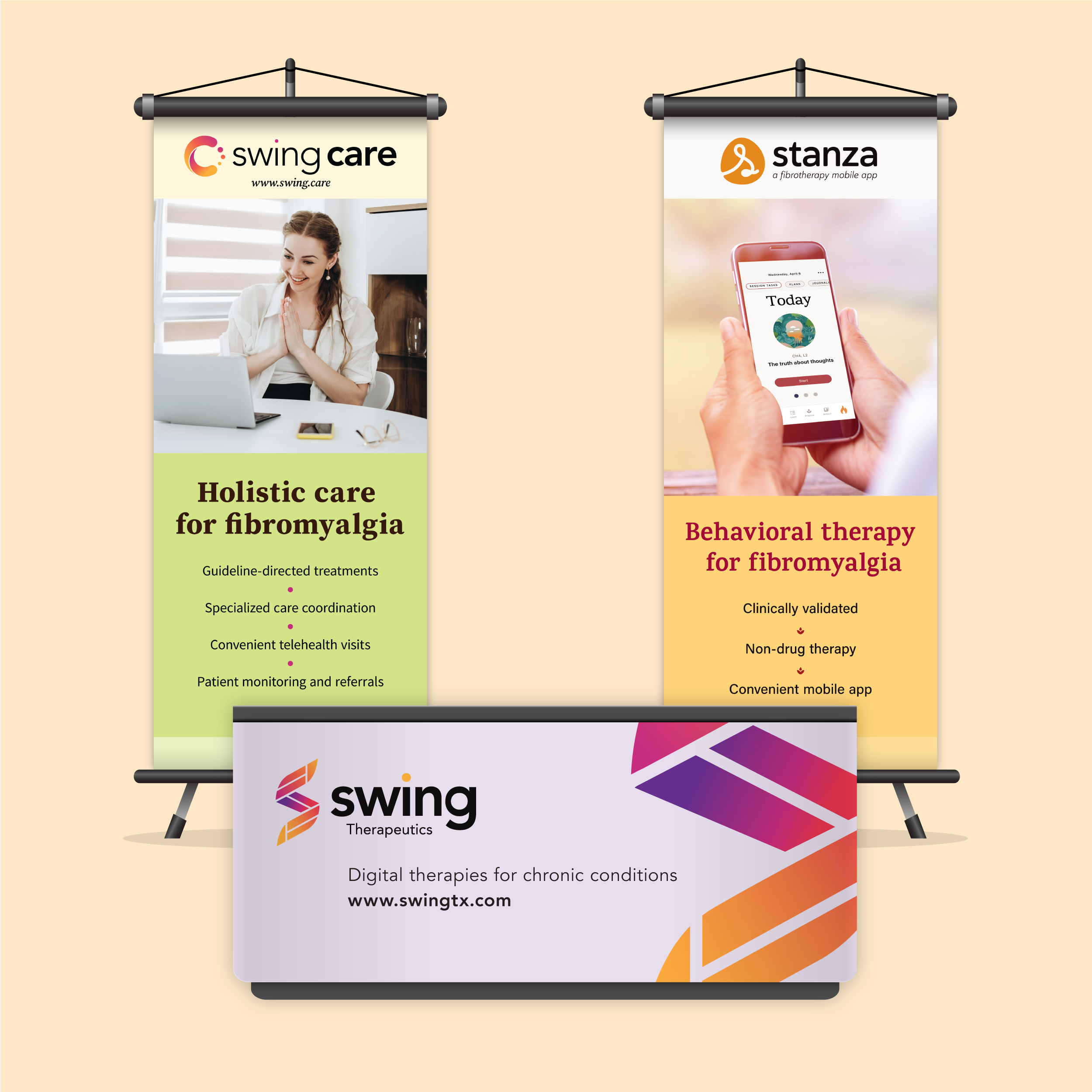 As a brand-new company entering the healthcare space, Swing Therapeutics needed to establish credibility and create awareness with healthcare providers. My challenge was to make three related brands, Swing Therapeutics, Stanza, and Swing Care, work together as a cohesive in-person presence while clearly communicating distinct offerings within tight budget and timeline constraints.